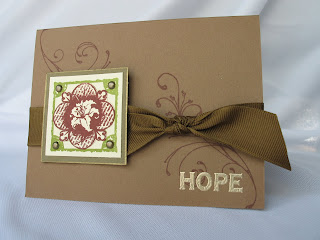 Today's post is an easy card idea that I think I might just copy and use with other sayings, colors and ribbon. It was incredibly easy, but I love the result. I used one of the tea bag folding tiles from Impression Obsession and stamped it twice. Once in green for the bottom layer and once in brown for the top. I cut out part of the image, glued it down, added some brads, matted it and then went to town on the actual card. I used the Filagree clear set from IO as well and some brown ink. Then I stamped and embossed the word "HOPE" from IO's word frames set. Put on a brown ribbon & you're done! This is one of those simple "every occassion" kind of card that I'll keep in my stash for just the right moment!