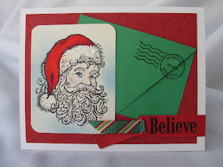 OK, It was 93 degrees here today and what was I doing? Getting a little Christmas in my heart! This card was fun to make. It was from a brand new Impression Obsession Clear Stamp Set full of fun little images! The Santa was stamped, chalked around the face with light blue and then colored with a mix of chalks and watercolor markers. I used chalks to color the face so that Santa wouldn't look freakish! After I colored him, I added glitter to the fluffy part of the hat and was done. The fake envelope was created by just making a small flap out of a folded piece of card stock. The fun "North Pole" stamp was also part of this set! You can't tell, but I also used a background stamp on the red piece of card stock. It's actually kind of a vine-like background also made by Impression Obsession. The "believe" is from a word frames set. But, can you "believe" this? The stamp set comes with a word believe but, I kid you not, I didn't see it until after I stamped the other one. Here I thought I was being all clever!!! Oh well. What can I say???!!??