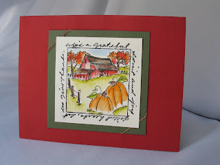 A few weeks ago, I picked up this stamp by Art Impressions at my LSS to get ready for a class on watercolor. I spent today painting in the colors of fall and thought---that time of year isn't all that far away! This card was done, not with traditional watercolor, but by "scribbling" watercolor pencils in areas and using an Aquaflow brush to blend and move the color on the watercolor paper. I can't wait until the summer, winter and spring images come in!