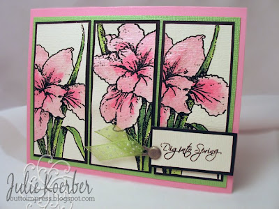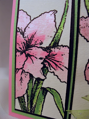 I used my new Siberian Iris stamp from Flourishes. Isn't this so pretty? I just love irises so I was a sucker for this stamp! I stamped it three times and embossed it with black detail embossing powder. I used embossing powder because I wanted to paint my flowers and, I don't know about you, but when I paint, I tend to bleed over the lines and it always dulls the black ink so that it just isn't as crisp looking. Embossing prevents that so that the paint sits on the paper better. I painted the image with my Twinkling H20s. LOVE these paints! If you wet your watercolor paper first ( I use Strathmore 140# cold press), the colors just bleed together to blend perfectly. The paints I used were Key Lime and Green Tea for my leaves and Cherry Sorbet and Pink Azalea for my flowers.
