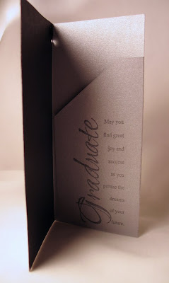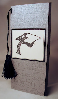 This next card I did as a money holder card. I tried to find a template that was like a card and the only thing I found was a website that helped you make your own card with printed images on it. Well, I actually ran through this program, printed it, and used it as a template for my card! THIS is the site if you want to try the same thing! I used silver Stardream paper, and stamped the success background stamp all over my template with Versamark ink. I love how subtle this effect is! I wasn't sure it would show up on metallic paper -- but it did! On the inside, I stamped the Graduation Sentiment (sorry, couldn't find a link to this one! It's also Paper Inspirations) It says, "Graduate, may you find great joy and success as you pursue the dreams of your future."