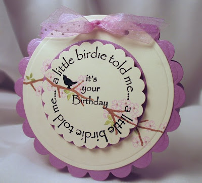 Edited to add: I forgot to include the source for the sentiments! How could I forget? This is sooooo cool! You can find the main circle "A little birdie." HERE. And check out all the cool things you can add to the center! I used It's Your Birthday. But, other sayings are - You're having a baby, You're getting married, You got a promotion, You have a new nest, You need a little cheering up. The fun thing about IO is that you can get these either wood mounted or cling. Cling is 40% off wood mounted prices! OK! I'll stop enabling now!! (Thanks Nancy for reminding me that I forgot to include these stamps! Guess I shouldn't post before I go to bed!!)