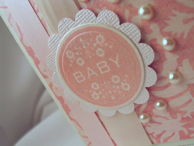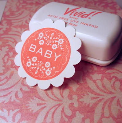 Now.... to the fun part!! I stamped the "Baby" stamp in Tea Rose Vivid! ink. See how bold it looks? It doesn't match the paper one bit! Well, I had an idea on how to tone it down after reading Sharon Johnson's Blog last week... create some LuminArte Shimmer!