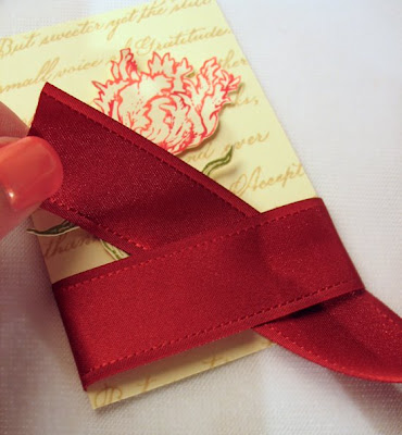 burgundy satin ribbon so that I have just enough to wrap around the piece I want to highlight with a tied knot.