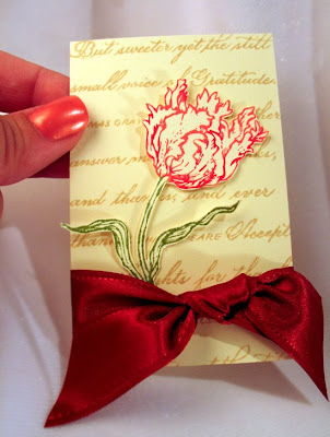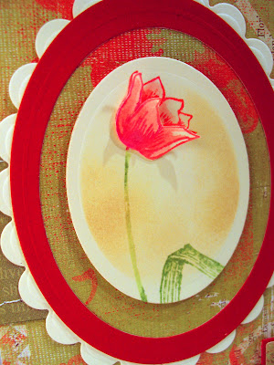 Here's a look at the card again. The front layer is actually the ivory piece matted on the red with the cut tulip on it. The inside front is the green decorative paper that I stuck to the inside by putting tape on the front of my dp.