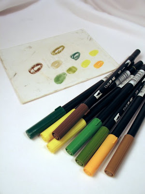 Grab some watercolor paper, and these colors of twinkling H20s - Sea Glass, Key Lime, Chiffon Pink, Pink Azalea, Golden Jade, Poppy Red - some burnt umber Palette ink, a waterbrush, a piece of paper towel, and you are pretty much ready to go!