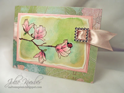 I painted my flowers with a watered down version of Chiffon Pink and while it was still wet, I dabbed some Pink Azalea on the areas that I wanted to shade. For the leaves, I colored them with Key Lime and while still wet, I dabbed on just a bit of Golden Jade. The ladybug was colored with a pretty strong version of Poppy Red. Then, I was ready for my watercolor wash on the backround. The key to creating a wash is to literally wet down the entire background, avoiding the stamped and colored image itself. This will help control where your color travels. Pick up the Key Lime and Sea Glass and literally scribble all over the background! If you get too much color on your background, all you do is blot some of it off with your paper towel. Keep working it until you've got it just the way you want it! That's it!