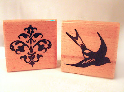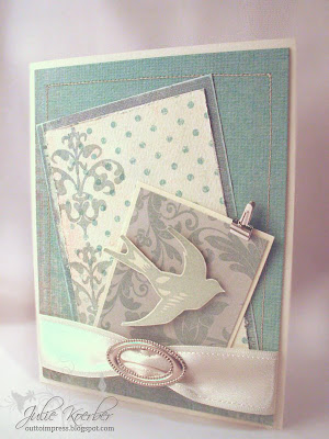 Before I even stamped my first image, I did pick out one color of ink (really old pigment ink pad from Anna Griffin) and a pile of scraps that color coordinated and I just stuck with that. My decorative paper scraps were from Prima, K & Company and Crate Paper. The ribbon is May Arts and the ribbon slides are a part of a new collection from Flourishes called Finishing Touches! The little clip is from Stampin' Up. From there, it really is just cutting paper and layering it up like the sketch!