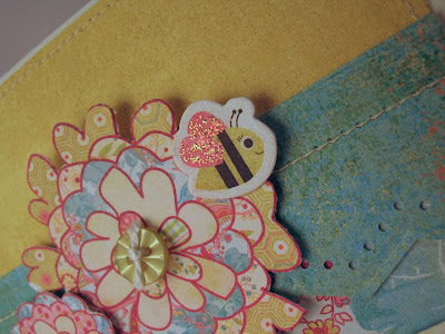 This one is a fun one because I used an envelope to house my tag card! Above, I took a regular A2 sized envelope, sealed it and then I cut the top off - about 1/16" off. After that, cover it with some decorative paper, paper pierce and stamp your flowers in a darker green to give a subtle effect on your card front. I used a large oval punch to create the opening for my tag and then used the same punch to punch an edge for my curved opening.