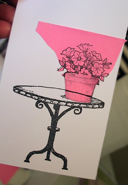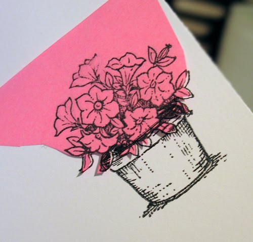 Next, make a mask for your petunias, place it overtop and then stamp a pot of your choice at the base. I used one of the pots from the DIY Topiary set.
