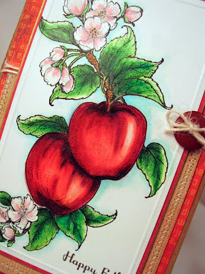 When I color with colored pencils, I love to layer the color -- I start with the darkest shades and then draw the color in and blend as I go. For the apple, I used Prismacolor Pencils in Indigo Blue (for only the darkest shading), Tuscan Red, Raspberry, Scarlet Lake, Poppy Red, Crimson Red, and Carmine Red. I also used a colorless blender in the areas I wanted to leave white. For the leaves I used: Dark Green, True Green, Apple Green, and then blended with cream. For the flower petals, I used Deco Pink and then blended with White for a softer look.