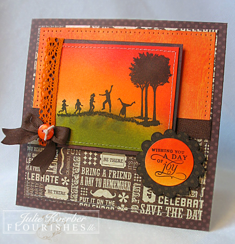 Okay, well, you had me crying all over again... and then you brought up our photo booth adventure and then I remembered a whole bunch of other stuff, and here I am just cracking up. Dang, that was fun! I had the BEST time and that's what I'm taking with me. Thanks for that! Beautiful job on this card, Julie! I love the warm colors, and the paper is awesome! Bless your great big heart for this day. Sure took me by surprise. Be seeing you around -- count on it!