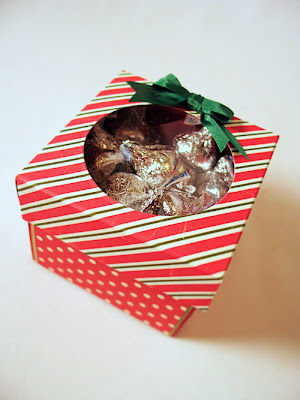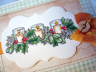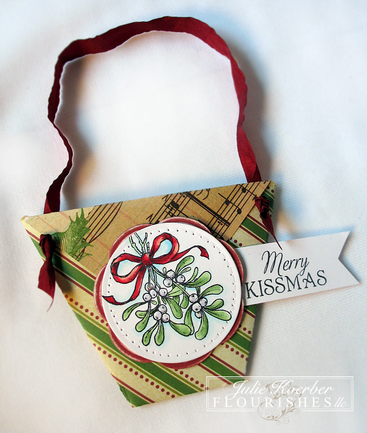 Copics using the Fields and Poppy Collections grouped by Flourishes. I accented around the image with colors B000 and B0000. Add some sparkle on my mistletoe berries thanks to some glitter glue, add some ribbon, a sentiment on a notched out strip of paper (also from the set) and some oh, so chocolatey kisses and hang it on the door for someone you love! Just that easy peasy! Here's a peek again.... I'm not going to tell you how many of those kisses are already missing... :-)