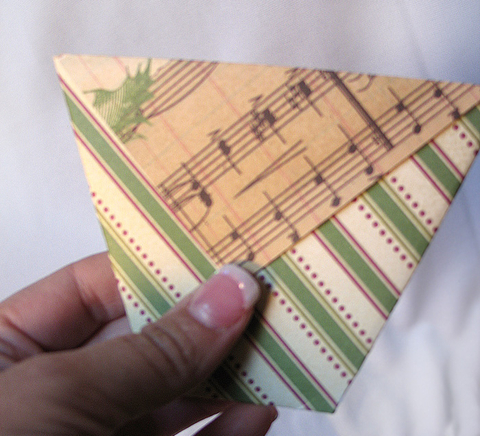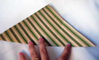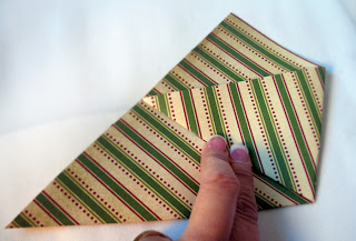 On to my creation! It's funny, my mother-in-law is addicted to those grocery store check out lane magazines and as I was flipping through, I actually found the project I created today! In the magazine, it showed you how you could fold old magazine pages to create an eco-friendly pocket for goodies. Mine, however, uses some decorative paper instead!