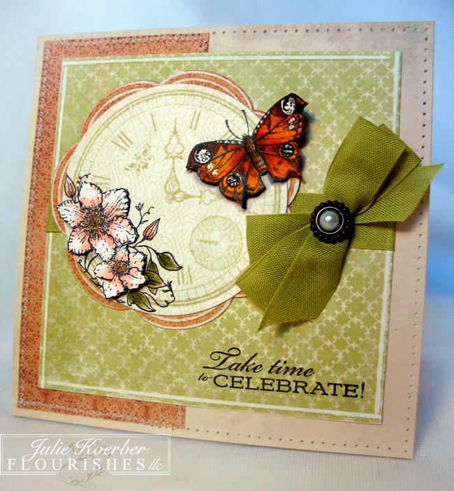 On to my creation! When I thought this through, I new that I wanted to use Flourishes Moments in Time set. BUT, I wanted to use it not in a masculine, but a feminine way. After letting my wheels spin on it for a while... here's what I came up with!