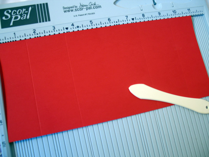 I started with a 11" by 4.5" piece of red card stock, and using my Scor-Pal, scored at the 1.5", 3.5", 7.5" and 9.5" score guides. The mission was to be able to create a "Z" fold on both sides like below...