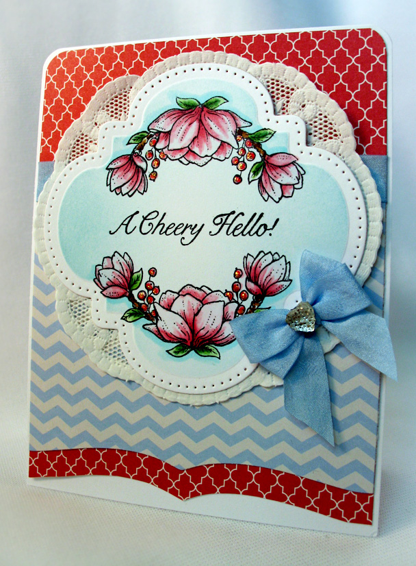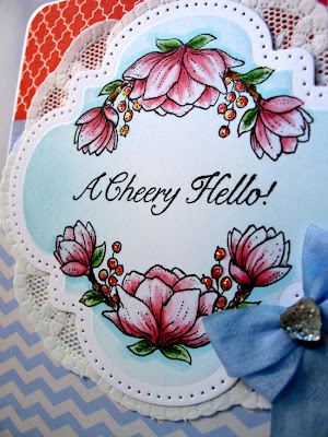 I started by using the Perfectly Pierced Classic Windows Die from Flourishes. I cut and embossed my shape from Flourishes Classic White and while the die was still on, I sponged on some Memento Summer Sky Ink. From there, I stamped one of the bracket style images (with those beautiful magnolias and berries) at the top and bottom of my die cut shape. I grabbed my Copic markers and... went to town coloring! (See the supplies used below for the colors I used!)