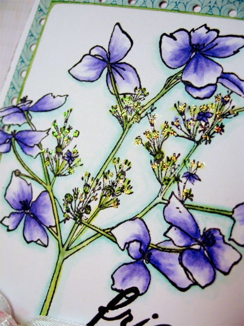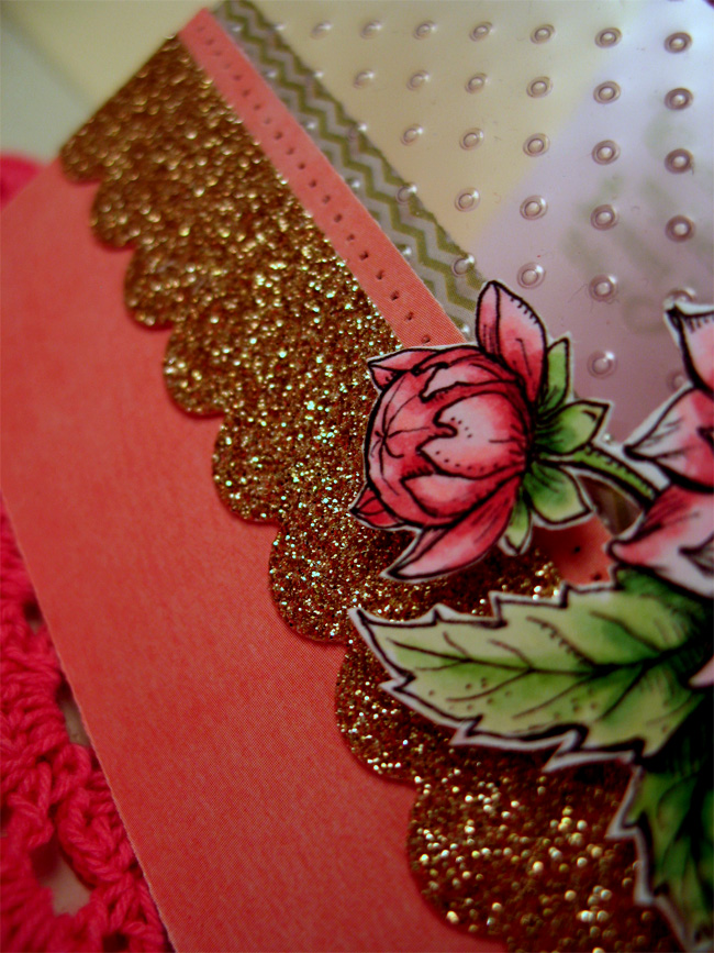 Because this gorgeous image is so large, I decided to keep my layout sweet and simple! I stamped my image on Flourishes Classic White using Tuxedo Memento Black ink. After stamping, I did stamp the sentiment and then ran my image through my Grand Callibur with the die called Fancy Ribbon Threader. After I was done embossing, I did trim around the embossed edge so that this portion of my flower could set on the main part of the die cut frame. I colored my image with Copic Markers (see list below for what colors I used!) I added a little white seam binding ribbon, a crystal button, some silver cording and... ta da! Done! I did add a little razzle dazzle with the help of some glitter glue. See?
