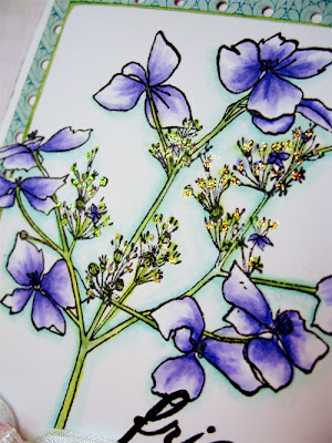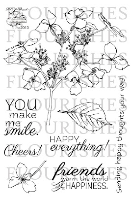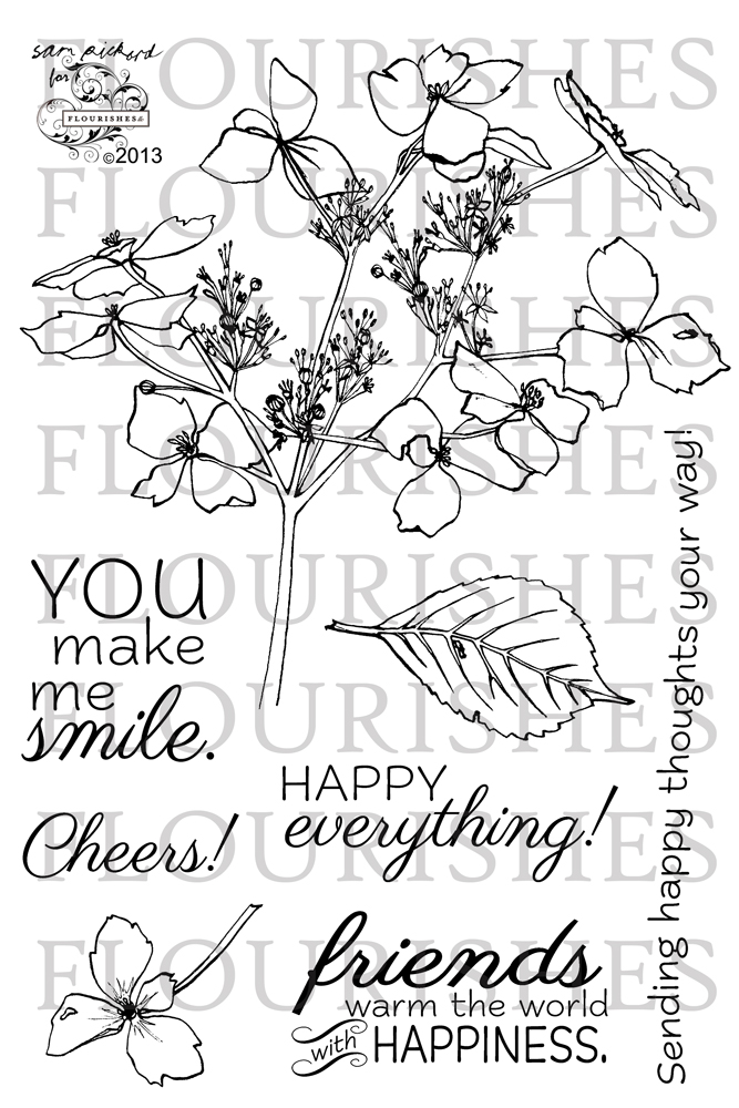 Otherwise known as the Flourishes Loyalty Incentive Program! How do you become a member? Starting TODAY, the next time you go shopping in the Flourishes online boutique and spend $100 on a single purchase (not including taxes or shipping), you will receive this beautiful stamp set called Happy Thoughts! It was penned by artist Sam Pickard and the fabulous sentiments were the creative genius of Dina Kowal! Keep in mind, you can't purchase this set -- the only way you can get your hands on this lovely floral spray of Hydrangeas and these beautifully scripted sentiments is to become a FLIP member!