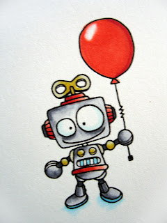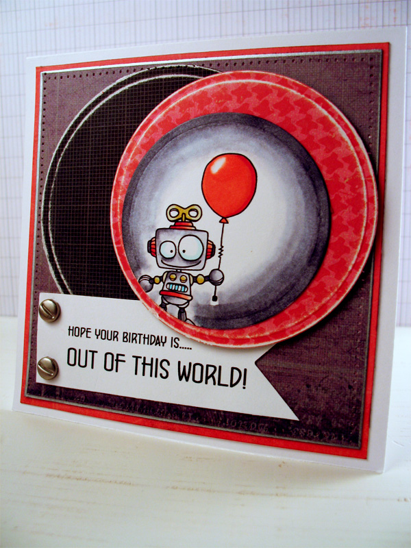So, you can imagine my distress when I went to die cut this little guy and my die moved, causing him to accidentally lose his little robot legs! EEK! That's where the making lemonade out of lemons comes into play! I decided to make it appear as if my little guy was peeking out of a tunnel. I used my Copic markers and picked up C00, C01, C03, C05 and C07 and just progressively got lighter as I moved toward the center. After I was done coloring, I matted onto a larger circle cut from decorative red paper and then, added my sentiment with some fun screw style brads.I did add some paper piercing and a little silver leaf around one of the decorative paper edges. And that, my friends, is it!