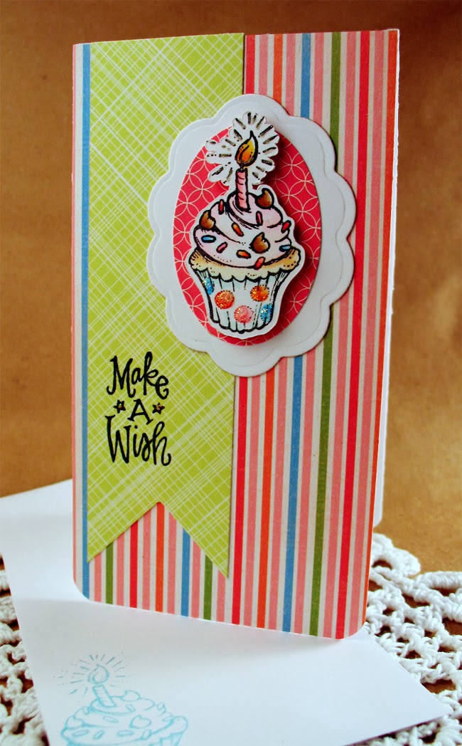 Here's card 1, perfect for birthdays! I stamped in Tuxedo Black Memento Ink and colored it all up with Copic Markers. The paper is a mix of Echo Park and Carta Bella (see supply list below). Super easy peasy!