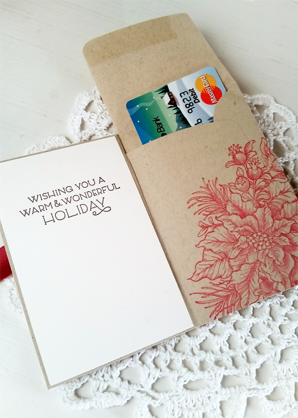 From here, I added a panel with a sentiment on one side to hide the sealed half flap. On the other side I stamped the poinsettia image in Love Note Memento Ink and blended the ink by running a blender pen over the stamped lines. I rounded the corner of the left side of the flap and as you can see, this half of your envelope creates the perfect pocket for your gift card!