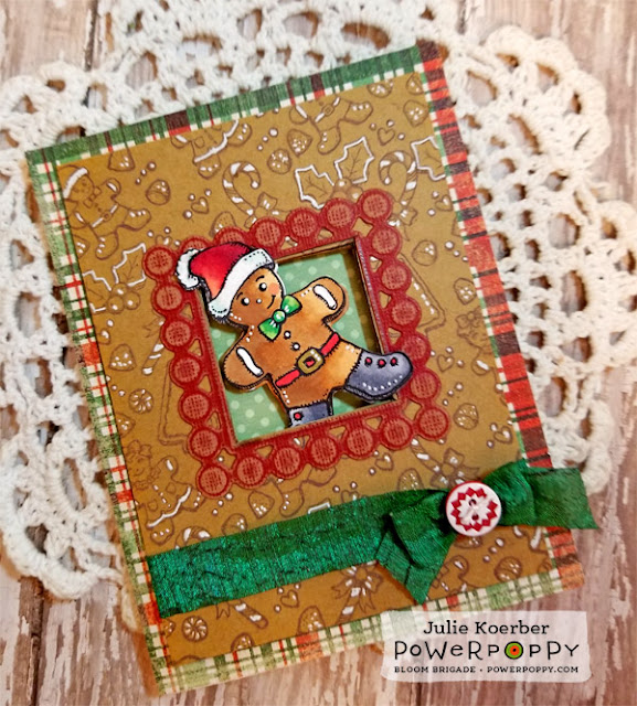 So, to get my little gingerbread man, stepping out from the frame, I put glue dots on the top of the hat on the lower leg that would be leaning out...